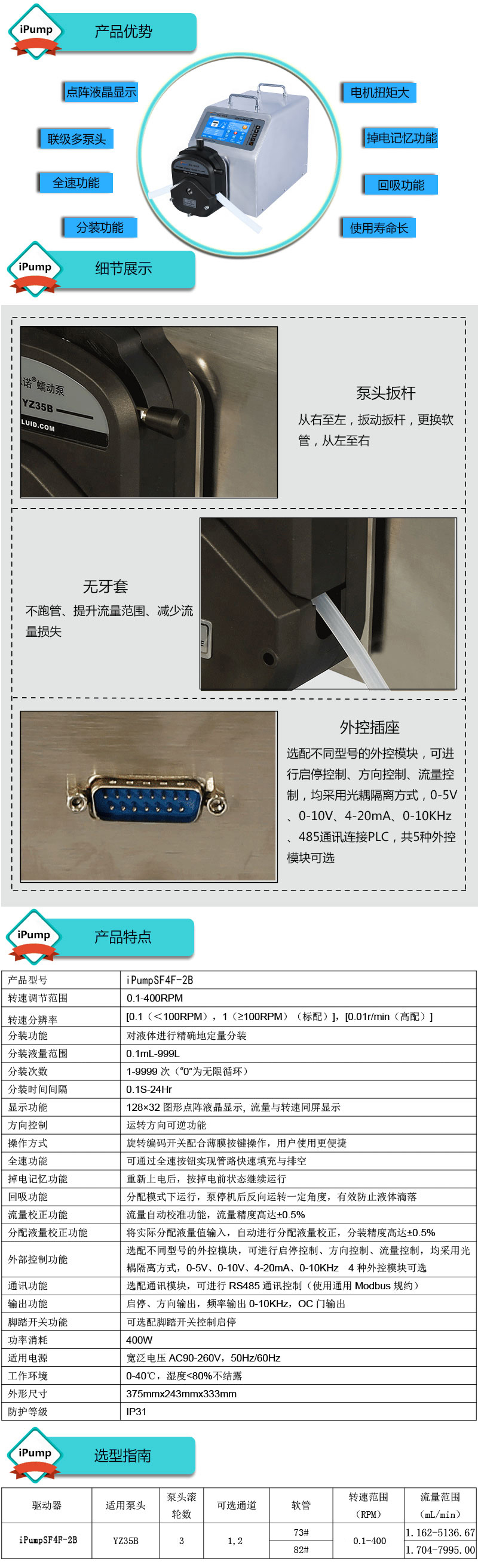 1.流量范圍:1.162-7995mL/min 2.兩種工作模式,流量模式與分配模式可選 3.具有流量校正、分裝液量校正功能 4.分裝精度高達±0.4%以內 5.采用伺服電機驅動,控制準,動力強勁 6.線路板全部三防漆處理,防腐、防潮